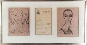 Kees VAN DONGEN (1877-1968). L.A.S., New-York [années 30], à un ami. 1 page in-8 à en-tête de l'hôtel The Waldorf-Astoria, encadrée entre deux gravures. 18 x 24 cm chaque (une tête de femme et trois nus féminins allongés). cadre : 72 x 38 cm. Il remercie son ami de ses voeux et va partir un mois pour Los Angeles : « Je vais voir comment on tourne un film en Amérique ». On joint un exemplaire de Van Dongen par Ed. des Courières (Henri Floury, 1925, exemplaire n° 91, débroché, défauts).