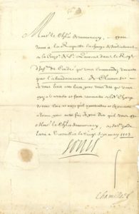 ROIS. 2 P.S. (secrétaires). Louis XIV : nomination d'un sous-lieutenant dans le régiment du Chevalier de Montmorency, Versailles 27 mai 1703, contresignée par Chamillart (1 p. in-fol., sceau sous papier). Louis XV : lettre de cachet pour la Bastille, Versailles 30 octobre 1765, contresignée par PHELYPEAUX (1 p. in-fol.). On joint un extrait des registres du conseil privé du roi (16 avril 1664), avec sceau de cire pendant.