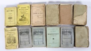 ENFANTINA. — La Petite Claire et sa mère. Strasbourg, litho. C. Fasoli et Ohlman, sd. (vers 1850). Cartonnage in-12, lithographie découpée collée sur le premier plat. Suite complète de 12 charmantes lithographies coloriées gommées. - Joint un ens. de vol. brochés, littérature de colportage et divers, XIXe s., dont : Ducray-Duminil. Les Orphelins du hameau. 1845. 4 vol. Hutter. Dialogue très facétieux. Librairie des bibliophiles, 1870. Almanach comique, 1843.