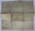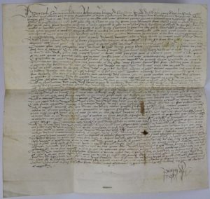CHARTE MÉDIÉVALE. Charte manuscrite en latin sur deux folios de parchemin cousus (619 x 862 mm) et pliés, rédigée à Bonnefont de Comminges en 1494 par le notaire Johannes de Vallibus , qui signe au bas du document. Confirmation d'un bail d'un domaine agricole (« villa ») par l'abbé Paul de l'abbaye de Bonnefont (« Bonifontis ») à ses habitants qui exploitent le domaine pour le compte des moines. Le document énumère les nombreuses obligations des habitants. Il est rédigé au bénéfice d'Arnaud Guilhem. Annotations modernes au dos. Coutures médiévales, lacune d'origine du parchemin (oeil), pliures, mouillures, déchirures sur les pliures et lacunes dans le haut du document entraînant des pertes importantes de texte.
