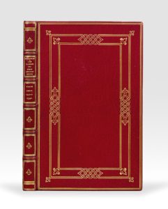 ♦ ÉSOPE. Les Fables. Paris, en l'imprimerie de Denis Janot, 1542. In-8, maroquin rouge, encadrement doré sur les plats formé de trois doubles filets dont deux s'entrelaçant au milieu de chaque côté, ponctués aux angles d'un petit fer, dos orné, dentelle intérieure, tranches dorées sur marbrure (Lortic).
