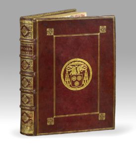 L'exemplaire porte sur une garde la mention J. J. de Bure l'aîné. collationné. complet. le 19 août 1825. En bas de la garde, selon son habitude, la mention c.d.m.m. 674 : indication de la provenance cabinet de ma mère, c'est-à-dire les livres les plus précieux de l'épouse du grand libraire Guillaume de Bure. Autre mention de sa main 1507 et au crayon le numéro d'ordre de Rahir 26770 (Nous n'avons pas trouvé cet exemplaire dans le Bulletin Morgand, qui décrit un exemplaire aux armes de Fléchier lui-même.) Discrètes restaurations aux mors (le long des caissons supérieurs et inférieurs).