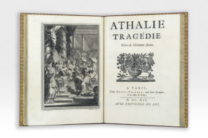 Chacune est ornée d'un frontispice gravé sur cuivre : celui d'Esther gravé par Sébastien Le Clerc d'après Le Brun, et celui d'Athalie gravé par Jean Mariette d'après Jean-Baptiste Corneille. Exemplaire d'Ernest Quentin Bauchart (1830-1909), avec son ex-libris, bibliographe et bibliophile notamment connu pour son ouvrage Les Femmes bibliophiles de France (1886).