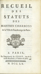 Les Statuts ne semblent pas répertoriés à la BnF. La communauté des charrons avait été constituée par Louis XII et les premiers statuts datent de 1498. Spécialiste du bois et du métal, le charron concevait, fabriquait, entretenait et réparait les carrosses, coches, charriots, litières, brancards, calèches et autres attirails liés au transport de personnes et de marchandises.