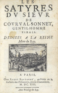 Édition originale de ces quatre satires de Thomas Sonnet, sieur de Courval (1577-1627), gentilhomme et poète normand à qui l'on doit une fameuse satire sur les poignantes traverses & incommodités du mariage (1609). L'auteur s'attaque ici aux usuriers, raillant les ecclésiastiques simoniaques, les officiers de justice tels ces juges cruels et corrompus remplis de tyrannie, qui tirent des pauvres gens la substance & la vie et qui enflent leurs bourses d'or, les meschans financiers, ou encore les médecins charlatans qui par drogues chimiques mirent ce pauvre Estat à deux doigts de la Mort. Le titre est orné d'une vignette allégorique montrant des femmes et des hommes enfermés dans une nasse. Le dernier feuillet précédant les Satires, présent ici, est orné au verso d'un beau portrait de l'auteur âgé de 45 ans, gravé en taille-douce par Matheus. Exemplaire un peu court de marges, dans une charmante reliure.