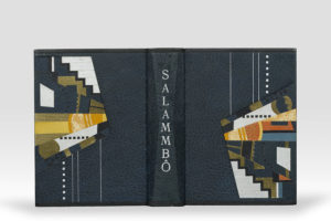 Un des 30 exemplaires de collaborateurs, hors-commerce : celui-ci exemplaire sur japon, enrichi de 2 rares suites des hors-texte, l'une en couleurs et l'autre en noir. Jolie reliure décorée, les compositions géométriques mosaïquées sur les plats inspirées du costume de la prêtresse de Tanit, « son grand manteau de pourpre sombre, taillé dans une étoffe inconnue », traduit dans la palette de Schmied. Né en 1968, Luigi Castiglioni, relieur-doreur installé près de Rimini, est l'un des représentants importants de la reliure contemporaine italienne. S'appuyant sur une forte technique traditionnelle, il revisite tant les compositions mosaïquées de Creuzevault et autres maîtres modernes que les reliures de style Art déco. Il a fait l'objet d'une exposition personnelle en 2005, à la galerie-librairie Fata Libelli, qui mit en lumière son travail et lui a assuré une notoriété aujourd'hui internationale. Il a également exposé à la librairie Éric Busser en 2017 et 2018 (cf. « Luigi Castiglioni, la renaissance de la reliure italienne » in Art et Métiers du Livre, n°285, 2011 ; Luigi Castiglioni, Più da vicino.