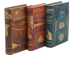 BRASSEY (Anna) — A Voyage in the 'Sunbeam', our home on the ocean for eleven months. Londres, Longmans, Green & Co., 1879. – Sunshine and Storm in the East, or Cruises to Cyprus and Constantinople. Ibid., 1881. – In the Trades, the Tropics and the 'Roaring Forties'. Ibid., 1886.