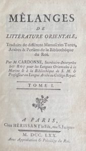 CARDONNE (Denis-Dominique) — Mélanges de littérature orientale, traduits de différens manuscrits turcs, arabes et persans de la Bibliothèque du roi.