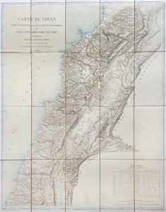 Paris, Dépôt de la Guerre, 1862. Carte lithographiée en couleurs (97 x 74,5 cm) divisée en vingt sections, entoilée au verso, sous chemise et étui de l'époque. Premier tirage de la première carte scientifique du Liban, l'une des plus importantes de l'histoire du pays, puisqu'elle servira à définir le « Grand Liban » proclamé à Beyrouth le 1er septembre 1920.