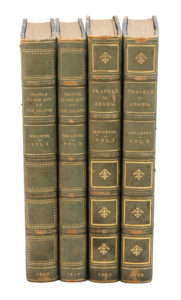 Londres, Henry Colburn, 1840. 2 vol. Ensemble 4 volumes in-8, demi-basane bleue avec coins, plats de percaline bleue, filets dorés, dos orné, tête dorée (Reliure anglaise de la fin du XIXe siècle).Éditions originales des deux relations de voyages en Arabie du lieutenant J. R. Wellsted (1805-1842).