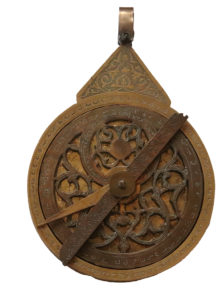 ASTROLABE — Laiton ciselé et gravé. Probablement Iran, XXe siècle. Hauteur : 17,3 cm ; Diamètre : 11,5 cm.