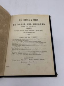 1- [ALBUM HAGUENTHAL] - Un Voyage à Paris ou le Paris des enfants, avec ses environs. Album composé de 32 sujets dessinés d'après nature, avec introduction. Paris, Pont-A-Mousson, Haguenthal, 1850, in-12, 16 planches, demi-toile grise, titre doré au centre du premier plat (reliure de l'éditeur). Coins abîmés, coupes frottées. Rousseurs. Rare album dépeignant les activités possibles de deux enfants lorsque leur mère leur fait faire des excursions autour ou dans Paris.