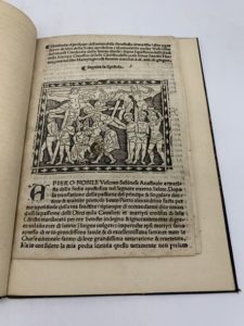 19- ANASTASE LE BIBLIOTHECAIRE . Comincia el prologo del venerabile Anastasio armarista, cioè guardiano de libri della Sedia apostolica, al venerabile padre veschovo Sabinense Cardinale della sancta chiesa, sopra la passione delli dieci mila martyri crocifixi di Iesu Christo : delli quali scrive sancto Hieronymo nel suo martylogio : ch[i] furono crocifixi a di xxii di giugno [Puis :] Comincia la historia delli dieci mila martyri crocifixi di Iesu Christo benedecto. S.l. [Florence ?], s.d. (1510 ?), in-8, [8] ff. n. ch., sign. ai/aii/aiii/a4 [-a8], impression à 40 lignes par page, avec un grand bois gravé naïf à demi-page au recto du premier feuillet (la scène du martyre des soldats), demi-maroquin à coins, dos lisse, titre poussé en long [Passione de dieci mila martiri. Firenze, 1510], double filet à froid sur les plats (reliure du XIXe s.). Rarissime opuscule hagiographique correspondant à la première traduction italienne d'une ancienne légende médiévale, décrite plus bas, et sans doute à la première édition séparée de ce texte. L'adresse et la date que nous fournissons sont reprises du titre poussé au dos, mais ne sont confirmées par aucun élément du texte : par exemple, aucun colophon ne le termine.