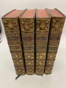 28- [AUBERT DE LA CHESNAYE DES BOIS (François-Alexandre)]. Dictionnaire raisonné et universel des animaux, ou Le Règne animal, consistant en quadrupèdes, cétacées [sic], oiseaux, reptiles, poissons, insectes, vers, zoophytes, ou plantes animales ; leurs propriétés en médecine ; la classe, la famille, ou l'ordre, le genre, l'espèce avec ses variétés, où chaque animal est rangé, suivant les différentes méthodes ou nouveaux systêmes de Messieurs Linnaeus, Klein & Brisson : par M. D. L. C. D.. B. Ouvrage composé d'après ce qu'ont écrit les naturalistes anciens & modernes, les historiens & les voyageurs. Paris, Claude-Jean-Baptiste Bauche, 1759, 4 forts vol. in-4, veau brun marbré, dos à nerfs orné, tranches rouges (reliure de l'époque). Unique édition. Quelques épidermures sur les plats, une coupe en partie abîmée, mais bon exemplaire.