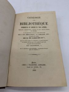 65- (CATALOGUE de BIBLIOTHÈQUE). [BIBLIOTHEQUE LA ROCHE-AYMON] - Catalogue d'une bibliothèque nombreuse et choisie en tous genres, théologie, jurisprudence, sciences et arts, belles lettres et histoire, et tout particulièrement curieuse par un grand nombre de livres sur l'art héraldique, la noblesse, etc., provenant du cabinet de M. de Laroche-Ay*** [La Roche-Aymon], dont la vente se fera le 8 décembre et jours suivants (...). Paris, J. Techener, 1846, in-8, demi-basane fauve racinée, dos lisse orné de filets dorés, pièce de titre bouteille, tranches mouchetées (reliure de l'époque). (1154F23). {215766} Importante collection centrée sur l'histoire et la noblesse (pp. 155-320). 2611 numéros décrits, prix d'adjudication à l'encre en regard. Ex-libris de la bibliothèque du château de Toury-sur-Abron.