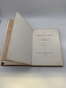 77- (CHASSE). LE COUTEULX DE CANTELEU (Jean-Emmanuel-Hector). La Chasse du loup. Avec des planches photographiques d'après nature par MM. Crémière, Hanfstaengl et Platel. Paris, Madame veuve Bouchard-Huzard, 1861, in-4, chagrin rouge, dos à nerfs orné, encadrement de filets dorés et à froid sur les plats, dentelle intérieure, tête dorée (reliure de l'époque). (237F23). {214494} Ouvrage mythique sur la chasse du loup, tiré à 150 exemplaires numérotés à la main (149/150), avec tirages photographiques originaux hors texte. 1/50 exemplaires du tirage de tête sur vélin, nominatif (le nom a été caviardé). Quelques épidermures sur les plats et usures aux coins. Rousseurs sur les serpentes. Bon exemplaire.