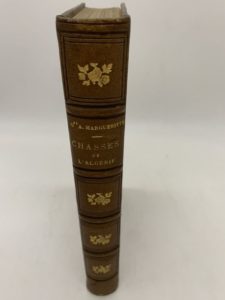 79- (CHASSE). MARGUERITTE (Auguste). Chasses de l'Algérie. Alger, Typographie Bastide, 1869, in-8, chagrin fauve, dos à nerfs orné, encadrement de triple filet à froid et de pointillés dorés sur les plats, tranches dorées (reliure de l'époque). Edition originale. Bel exemplaire.