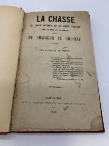 80- (CHASSE). MERLE (Alphonse de). La Chasse au chien d'arrêt et au chien courant dans le midi de la France. Suivie du Chasseur au groseau (poésie). Carpentras, L. Grivot-Proyet, 1859, in-12, demi-toile Bradel rouge (rel. du XXe s.). (361F23). {221279} Unique édition, très rare, de ce véritable traité de la chasse méridionale, plus spécifiquement provençale. Réparations maladroites de papier aux deux premiers feuillets.