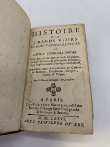 83- [CHASSEPOL (François de)]. Histoire des Grands Vizirs Mahomet Coprogli-Pacha et Achmet Coprogli-Pacha. Celle des trois derniers grands Seigneurs ; de leurs sultanes, & principales favorites ; avec les plus secrettes intrigues du serrail. Avec le plan de la bataille de Cotzchin [= Chocim]. Paris, Etienne Michallet, 1676, in-12, basane fauve modeste, dos à nerfs orné (reliure de l'époque). Edition originale, complète en un volume. Avec la grande vue de la bataille de Chocim ou Chotim. Reliure un peu frottée. Petit manque angulaire à la planche.