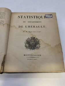 94- CREUZE DE LESSER (Hippolyte). Statistique du département de l'Hérault. Montpellier, Imprimerie d'Auguste Ricard, 1824, in-4, demi-basane aubergine, dos à nerfs orné de fleurons dorés (Vielzeuf) Edition originale. Exemplaire de travail avec d'importantes mouillures, des galeries de vers aux pp. 483-507., et auquel les cartes manquent. Envoi autographe de l'auteur au mathématicien Joseph Diez Gergonne (1771-1859).