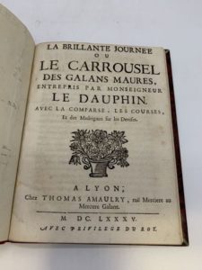 101- [DONNEAU DE VIZÉ (Jean)]. La Brillante journée, ou Le Carrousel des galans Maures, entrepris par Monseigneur le Dauphin. Avec la comparse, les courses, et des madrigaux sur les devises. Lyon, Thomas Amaulry, 1685, petit in-4, demi-chagrin rouge, dos lisse (reliure du XIXe s.). Édition lyonnaise parue la même année que l'originale parisienne. Description d'un somptueux carrousel tenu à Versailles le 4 juin 1685. Exemplaire de Désiré-François Ruggieri (1818-1885), avec son ex-libris. Il passa ensuite dans la collection, de Henri Gallice (ex-libris).