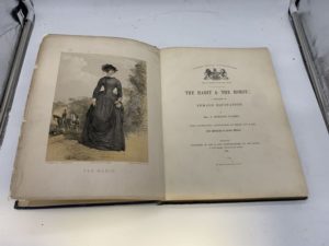 112- (ÉQUITATION). CLARKE (J. Stirling). The Habit & the horse, a treatise on female equitation. With illustrations, lithographes by Messrs. Day & Son, from photographs by Herbert Watkins. London, Day & Son, 1860, in-4, percaline bleue, premier plat illustré, tranches dorées (reliure de l'éditeur). Nouvelle édition, la première datant de 1857, de ce guide d'équitation à l'usage des femmes, par Mme Clarke Stirling. 9 planches dont 6 lithographies en couleurs. Percaline frottée aux coiffes et aux mors, coins abîmés, plats salis et tachés. Légères mouillures angulaires sur les lithographies. Le frontispice, dont un bord comporte des déchirures, a été remonté sur papier fort.
