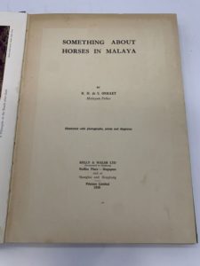 114- (ÉQUITATION). ONRAET (René-Henry de Solminihac). Something about horses in Malaya. …