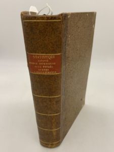 116- ESTIENNE (Émiland). Statistique de la Batavie. Imprimée par ordre du ministre de l'Intérieur. Paris, Imprimerie des sourds-muets, Le Clère, Henrichs, Treuttel et Würtz, an XI (1803), in-8, demi-basane fauve, dos lisse orné tranches citron mouchetées de bleu (reliure de l'époque). Édition originale. Deux tableaux repliés. Reliées à la suite quatre autres statistiques départementales liées à la grande enquête demandée par le ministère de l'Intérieur et concernant des départements de l'actuelle Belgique : I. CAVENNE (François-Alexandre) : Statistique du département de la Meuse-inférieure ; approuvée pour être présentée au Ministre de l'Intérieur, par le citoyen Loysel, préfet (...). Maestricht, Imprimerie de Th. Nypels, thermidor an X - II. HERBOUVILLE (Charles-Joseph-Fortuné d') : Statistique du département des Deux-Nèthes. Publiée par ordre du ministre de l'Intérieur. Paris, Imprimerie des sourds-muets, an X [1802], avec 5 tableaux dépliants hors texte, dont 4 "in fine". III. DESMOUSSEAUX DE GIVRÉ (Antoine-François) : Statistique du département de l'Ourthe. Publiée par ordre du ministre de l'Intérieur. Paris, Imprimerie des sourds-muets, an X [1802]. IV. JARDRINET : Statistique du département de Sambre-et-Meuse ; rédigée sous les yeux du citoyen Pérès, préfet, par le citoyen Jardrinet, membre du Conseil municipal de Namur (...). Publié par ordre du ministre de l'Intérieur. Paris, Imprimerie des sourds-muets, an X [1802], avec 2 tableaux dépliants hors texte. Manque de papier au feuillet de titre du premier texte, avec perte de lettres ; les autres titres, salis. Remarquable recueil de publications statistiques destiné à connaître sous les aspects industriels, commerciaux, agricoles, les départements annexés à la période du Consulat.