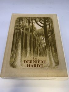 130- GENEVOIX (Maurice). La Dernière harde. Avec des bois originaux en couleurs d'André Margat. Paris, Vialetay, 1953, in-4, avec des illustrations en couleurs dans le texte. en feuilles sous chemise illustrée et rempliée, dans double emboîtage cartonné (reliure de l'éditeur). Tirage limité à 239 exemplaires. Celui-ci, un des dix exemplaires d'artiste réservés à André Margat, portant la signature autographe de l'auteur et de l'illustrateur. Il est complété par plusieurs documents annexes : 1. Un bois original colorié et enrichi d'un envoi autographe de Margat : "Pour Robert Blanchet, en souvenir de tant de bois qui furent pressés ... et bien pressés. Amicalement. 1953". 2. Une suite de 12 bois illustrant l'ouvrage (mais ne comprenant que 6 sujets, plusieurs se présentant en double ou quadruple). 3. Deux exemplaires (bifeuillets in-8) de l'invitation à l'exposition de présentation du livre, donnée du 30 juin au 7 juillet 1953 dans les salons de la librairie Kléber. 4. Enfin, 13 cartes de voeux composées par Margat et se présentant sous forme de petits bifeuillets in-12 ou in-8 ornés chacun d'un bois en couleurs et d'une sentence imprimée, et parfois d'un mot autographe de Margat. Nous avons les années 1952, 1957, 1959, 1960, 1961, 1965 (2 cartes différentes), 1966, 1968 ; plus 4 cartes non datées. Exemplaire de Robert Blanchet (1921-2009), pressier d'art, graveur sur bois, typographe et artiste graphique. Emboîtage extérieur défraîchi.