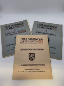 138- (HÉRALDIQUE). HANSI (Jean-Jacques Waltz, dit). L' Art héraldique en Alsace. Documents héraldiques dessinés et commentés. Nancy, Paris, Strasbourg, Berger-Levrault, 1938-1949, 3 fascicules in-4 en feuilles, sous couvertures illustrées. Edition originale tirée à 575 exemplaires numérotés. 3 planches en couleurs et nombreuses illustrations dans le texte. Il n'y a pas de page de titre aux fascicules I et II.
