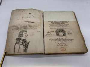 141- (HÉRALDIQUE). SEGOING (Charles). [Mercure armorial, enseignant les principes & élemens du blazon des armoiries, selon l'ordre & les termes qui se pratiquent en cette science]. Enrichy & augmenté d'un grand nombre de figures enluminées de couleurs propres pour l'intelligence du livre. Seconde édition, reveuë, corrigée & augmentée. Paris, Pierre Aubouyn, 1652, in-4, vélin souple (reliure de l'époque). Nombreux blasons gravés sur bois. La plupart sont coloriés à la main. Exemplaire un peu déboîté, dessins et essais de plume sur les premières gardes, pp. 124-125 salies. Manque la partie supérieure du feuillet de titre. Ex-libris de la comtesse Chappaz de la Prat.