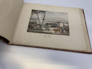 156- LAMI (Eugène). Souvenirs du camp de Lunéville. Paris, Delpuech, 1829, in-4 oblong, demi-chevrette rouge à coins, dos lisse orné, couverture imprimée conservée (rel. de la fin du XIXe siècle). Suite de 6 planches gravées et coloriées. Mors, coiffes et coins usés.
