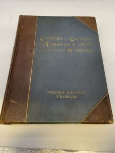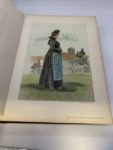 163- LAUGEL (Anselme), SPINDLER (Charles). Costumes et coutumes d'Alsace. Texte par A. Laugel. - Planches et dessins par Ch. Spindler. Strasbourg, G. Fischbach, 1902, in-folio, demi-basane fauve gaufrée à coins, dos lisse orné tranches rouges (reliure de l'éditeur). (526F23). {223836} Édition originale de ce bel album, comprenant 61 planches, dont 60 planches de costumes en couleurs. Légères épidermures sur le plat supérieur, usures aux coins.