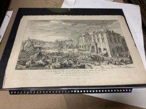 183- [MARSEILLE] - Veuë de l'hôtel de ville de Marseille, et d'une partie de son port dessiné sur le lieu pendant la peste arrivée en 1720. Paris, Limosin, s.d., gravure in-folio oblongue (44 X 63 cm). Très rare gravure sur cuivre par Jacques Rigaud.
