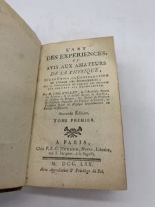 198- NOLLET (Jean-Antoine). L'Art des expériences, ou Avis aux amateurs de la physique, sur le choix, la construction et l'usage des instruments ; sur la préparation et l'emploi des drogues qui servent aux expériences. Paris, P.-E.-G. Durand, 1770, 3 vol. in-12, basane fauve marbrée, dos à nerfs orné, tranches rouges (reliure de l'époque). Mention de seconde édition mais à la date de l'édition originale. Complet des 56 planches repliées. Trois coiffes usées, début de fente à certains mors.