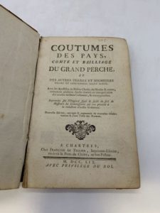 201- [PERCHE] - DU MOULIN (Charles). Coutumes des pays, comté et baillage du Grand Perche, et des autres terres et seigneuries régies & gouvernées selon iceux. Chartres, F. Le Tellier, 1759, in-8, basane fauve, dos à nerfs (reliure de l'époque). Cette nouvelle édition est une remise en vente de celle accordée par privilège en mai 1737 au libraire Nicolas Doublet. Manques au dos et aux coins.