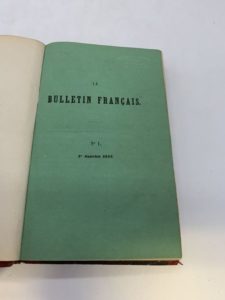 202- [PERIODIQUE] - Le Bulletin français, [suivi de :] Le Nouveau bulletin français. S.l. [Bruxelles, puis Londres], [W. Jeffs], 1er janvier 1852-24 juin 1852, 19 livraisons en un vol. in-8, demi-basane cerise à coins, dos lisse orné, première couverture conservée (reliure de l'époque) Tout ce qui a paru de ce très rare périodique anti-bonapartiste, de tendance orléaniste, fondé à Bruxelles au lendemain du coup d'Etat, et transféré à Londres à cause d'un procès devant les assises du Brabant. Deux mors supérieurs fendus. Ex-libris et cartouche de la bibliothèque du Cercle de l'Union.
