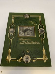 204- PERIQUET (Louis). Ministère des colonies. Rapport général sur la mission de délimitation Afrique équatoriale française - Cameroun, (1912-1913-1914). Paris, René Chapelot, 1915-1916, 4 tomes en 3 vol. pet. in-4, percaline verte de l'époque, plat supérieur orné d'un décor noir et or avec reproductions de photographies au centre et sur les côtés, en médaillon [atlas]. C'est tout ce qui a paru de ce compte-rendu rare, une fois précisé que le volume II n'a jamais été édité, et que l'atlas, rarissime, semble avoir échappé aux catalogues. I. Astronomie. Topographie. Altimétrie. Radiotélégraphie. - II. [non paru]. - III. La flore et la faune en Afrique équatoriale française. Cultures et animaux domestiques. - IV. Vocabulaires. - V. [Atlas de photographies].