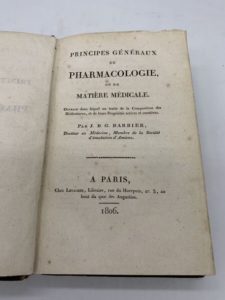 206- (PHARMACIE). BARBIER (Jean-Baptiste-Grégoire). Exposition de nouveaux principes de pharmacologie, qui forment de la matière médicale une science nouvelle ; présentés et soutenus à l'Ecole de médecine de Paris le [] pluviôse an 11 [février 1803]. Paris, P. F. Rigot, an XI - 1803, in-8, demi-basane fauve, dos lisse orné tranches jaunes mouchetées de bleu (reliure de l'époque). Edition originale. Reliés à la suite deux autres ouvrages de pharmacie : I. [PARMENTIER (Antoine-Augustin) :] Pharmacopée à l'usage des hospices civils, des secours à domicile, des prisons et dépôts de mendicité. Publiée par ordre du Ministre de l'intérieur. Paris, Imprimerie de la République, an XI [1803.. II. CARBONELL Y BRAVO (Francesc) : Pharmaciae elementa chemiae recentioris fundamentis innixa. Barcelone et Paris, Méquignon [Imprimerie de Crapelet], 1800. Manque de cuir en coiffe inférieure.