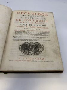 222- [RIVET DE LA GRANGE (Antoine)]. Nécrologe de l'Abbaïe de Nôtre-Dame de Port-Roïal des Champs, Ordre de Cîteaux, Institut du Saint Sacrement ; qui contient les éloges historiques avec les épitaphes des fondateurs & bienfaiteurs de ce monastère. Amsterdam [France], Nicolas Potgieter, 1723, in-4, basane havane, dos à nerfs, tranches mouchetées de rouge (reliure de l'époque). Édition originale ornée de 12 vignettes en-tête gravées sur cuivre. Coiffes usées, coins abîmés.