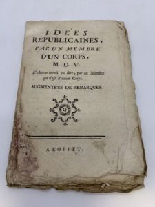 260- [VOLTAIRE]. Idées républicaines, par un membre d'un corps, M. D. V. L'auteur auroit pu dire, par un membre qui n'est d'aucun corps. Augmentées de remarques. Coppet [Genève], s.d. (1765), in-8, en feuilles, cousu. {203424} Seconde édition de cette critique des idées exprimées par Rousseau dans son Contrat social, et aussi de certaines conceptions de Montesquieu. Usures et traces d'humidité sur le rebord intérieur des feuillets.