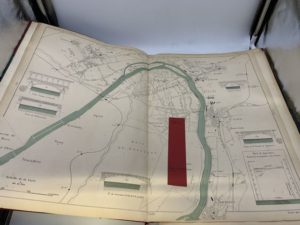 262- VUILLAUME (R.). Carte de la rivière de Seine de Paris à Rouen, dressée du point de vue spécial de la navigation par R. Vuillaume, gravée par L. Sonnet. 2e édition. Paris, Imprimerie Monrocq, 1886, in-folio, en feuilles, dans chemise demi-toile chagrinée cerise à coins, dos lisse muet, titre en lettres dorées au centre du plat supérieur (reliure de l'éditeur). 26 planches à double page. Tête du dos abîmée, traces d'humidité sur les plats. Intérieur en bon état.