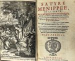 SATYRE MENIPPÉE, de la vertu du Catholicon d’Espagne, et de la tenue des états de Paris. Ratisbonne, Héritiers de Mathias Kerner, 1726. 3 volumes in-8, veau blond, dos orné, tranches rouges (Reliure de l’époque). Ex-libris gravé et armorié Mr de Manscourt.