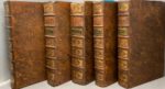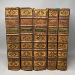MORERI Louis, Supplément au dictionnaire Historique, géographique, généalogique, &c. des éditions de Basle de 1732 & 1733, La veuve de Jean Christ, Basle, 1743, 9 volumes, In-folio Reliure plein veau marbré, dos à nerfs et caisson dorés ornés, tranches rouges Pour l'ensemble : mauvais état général de la reliure, fortes épidermures et manques à la dorure, traces d'humidité et brunissement des pages Non collationné