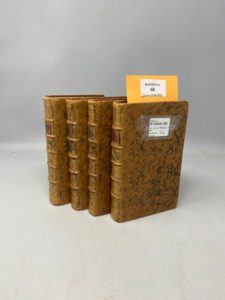 VILLARS (Maréchal de). Vie du maréchal duc de Villars, écrite par lui-même. Et donnée au public par M. Anquetil. Paris, Moutard, 1784. 4 volumes in-12, veau marbré, dos orné, pièces de titre et de tomaison, tranches rouges (Reliure de l’époque). Édition originale, ornée d’un portrait de l’auteur et de 4 plans dépliants de bataille. Le duc de Villars s’illustra dans la Guerre de succession d’Espagne (1701-1714) : il infligea notamment de lourdes pertes aux forces commandées par le prince Eugène et le duc de Marlborough à la sanglante bataille de Malplaquet (1709) et négocia le traité de Rastatt qui mit fin à la guerre entre Louis XIV et Charles VI. Joli exemplaire, bien relié. Petits frottements à la reliure.