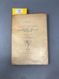 HUGO Victor Cinq poèmes, ornés de trente-cinq compositions (A. Rodin, E. Carrière, Wilette, Steinlen...). Paris, éd° d'art Ed. Pelletan, 1902. L'un des 193 ex. sur vélin à la cuve des papeteries du Marais, celui-ci n° 133/250. Mors interne cassé, rousseurs.