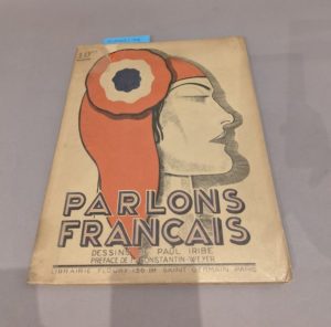 IRIBE (Paul). Parlons Français. Dessins de Paul IRIBE. Préface de M. Constantin-Weyer. Paris, Floury, 1934. In-folio broché, couv. illustrée en couleurs. 37 dessins satiriques en noir, rouge et bleu : 33 planches dont 15 dépliantes, couverture, page de titre, bandeau et cul de lampe. Bon état, très légères rousseurs.