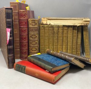 BEL ENSEMBLE OUVRAGES DIVERS VALLERY-RADOT René - La vie de Pasteur - Editions Librairie Hachette et Cie - Paris, 1912 - In-8 Reliure à bande Assez bon état, quelques traces d'usures, d'humidité et d'insolation J.-J. - E. ROY - Histoire des Templiers - Deuxième éditions Ad Mame et Cie, 1851 - Bibliothèque de la jeunesse chrétienne, approuvée par Monseigneur l'Archevèque de Tours Fiche intérieur avec mention"Lycée de Dijon, classe de quatrième , prix de travail et de bonne conduite décerné à l'élève Bafsot (?) le 28 avril 1855" CONCOURT Jules et Edmond - Madame de Pompadour - Editions Firmin Didot, paris, 1888 - In-4 Illustré de 55 reproductions sur cuivre de Dujardin et de deux planches en couleur par Quinsac d'après des originaux de l'époque CARTHY J. Marc - Choix de voyages dans les quatre parties du monde - Edition de l'imprimerie de Rignoux - Paris - 1821 - In-8 - 10 volumes 5 volumes sont illustrés d'une carte dépliante (monde, continent...) 5 volumes illustrés d'une gravure Reliure à bande vertes, dos à caissons dorés et tranches marmoréenne. Bon état, coiffes légèrement arasées. L'intérieur présente des piqures et quelques tâches. KLACZKO Julian - Deux Chanceliers, le prince Gortchakof et le prince de Bismarck - Editions Plon - Paris 1876 - In-8 Reliure à banes en tissu rouge, dosà caisson noir et titre doré Bon état, mords légèrement fendus, intérieurs légèrement taché et présentant des traces d'insolation VERCEL Roger - Capitaine Conan - Editions Albin Michel - Paris - 1934 - In-12 Reliure à bande en cuir brun, dos à nerfs. Bon état, légères épidermures et coiffe arasée, légère insolation DUHAMEL Georges - Géographie cordiale de l'Europe" - Editions Mercure France - Paris - 1931- In-12 Reliure à bandes en cuire, dos à nerf. Bon état, légère insolation. GAUTHIEZ Pierre - Paris - Aqurelle de Paul Emile LECOMTE, Editions J; Rey - B. Arthaud, Grenoble, 1928 - in-folio Demi reliure à coin en cuir rouge, dos à nerfs et caissons doré Coins émoussés, épidemures 1 volume dans un étuit CAMON AENAR José - Los disparates, de Goya y sus dibujos prepatorios - Editions de l'Instituto amatller de arte hispanico - Barcelona - 1951 - In-4 Exemplaire numéroté 208 Demi reliure à coin en cuir, dos à nerfs et caisson doré Bon état, coins légèrement moussés et coiffe arasée. A.LECOY DE LA MARCHE Le treizième siècle artistique, Société Saint Augustin, Desclée, de Brouwer & Cie, 1903 - In-4 Ouvrage illustré de 190 gravures Vendu en l'état et sans réclamations