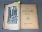 BEL ENSEMBLE DE VOLUMES THOREL (L.L de). La conquête de l'air ... Paris, Casterman, s.d., in-4, 324 pp., toile rouge et noire, tranches dorées. (Rél. de l'éd). Nombreuses figures à pleine page. Premier plat fragile, partiellement détaché. GARUFFA (E) Dirigeables à raréfaction. Le navire aérien A. V. 2. Vaugean-Gargiulo... Paris, E.Chiron, 1921, in-8, 69, (1bl. ) pp. , 2pl., demi-toile grise. (Rel. mod). Deux pl. h. t. dont l'une représentant le dirigeable A. V. 2. REITLINGER (F). Une mission diplomatique en Octobre 1870. DE Paris à Vienne et à Londres... Paris et Nancy, 1899, in-8, (6), 252 pp. , demi-chagrin lie-de vin, couv. cons. (Rel. de l'ép. ) . Relation de la sortie de Paris par le ballon Le Vauban. Reliure ornée d'un ballon doré sur le dos. On y joint le chapitre 7 de : TISSANDIER (G.). Histoire de mes ascensions. Récit de quarante voyages aériens (1868-1886) ... Paris, M. Dreyfous, 1887 Très nombreuses fig. gravées sur le bois dans le texte ou à pleine page. Rousseurs. RIBAS CADAVAL. Tratado de Aeronautica. Navegaçao Aerea ... Anvers, CL. Thibaut, 1911, in-8, 392 pp. , percaline bordeaux. (Rel. de l'éd ) . Envoi autographe signé de l'auteur à Paul Adam. Dos partiellement décollé. LA VAUX (Compte de). Les vainqueurs de l'air. Histoire de l'aéronautique. Ses débuts sportifs. Son application militaire. Sa réalisation commerciale... Paris, lib. Hachette, 1921, in-8, front. , 246, (2) pp pl., percaline bordeaux frappée or et noir. (Rel. de l'éd). Front. et vingt-deux pl. h.t. Mors fendus. La clef des airs. Direction aérienne. Résolution du problème avec description et dessin suivi d'une formule qui fait connaître la pression du vent sur la surface d'un ballon et les erreurs de la direction aérienne ... S. l. n. d. (1874), in-8, 4, (4)pp. , 1pl, 10, 3, (1 bl.), 7, (1bl.) pp. , cart. mod. Reliure fragile et partiellement arrachée. Vendu en l'état, sans réclamations Regroup /19/22/25/30/31