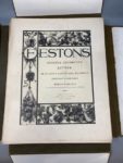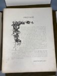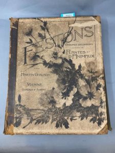 GERLACH, Martin. - Festons und Decorative Gruppen, aus Pflanzen und Thieren (Festons, ornements décoratifs composé de plantes et d'animaux).- Wien, Gerlach & Schenk, 1899.- In-folio, en feuilles, sous portefeuille illustré à rabats demi-chagrin havane à coins de l'éditeur. Troisième édition de cet ouvrage peu commun composé d'un titre illustré, de 3 feuillets de texte explicatif et index et de 141 planches en héliogravure (chiffrées 1-140, 108a) le plus souvent en deux tons. L'iconographie présente des compositions élaborées combinant plantes, fleurs et fruits avec des coquillages, poissons, oiseaux, reptiles et autres accessoires formant des combinaisons vraiment uniques. Portefeuille présentant des défauts d'usage et des épidermures, excellent état intérieur. Absence des planches numéros : 13-24-28-32-51-53-56-57-65-90-61-99-108 ainsi que les planches XIII et XIX concernant l'alphabet.